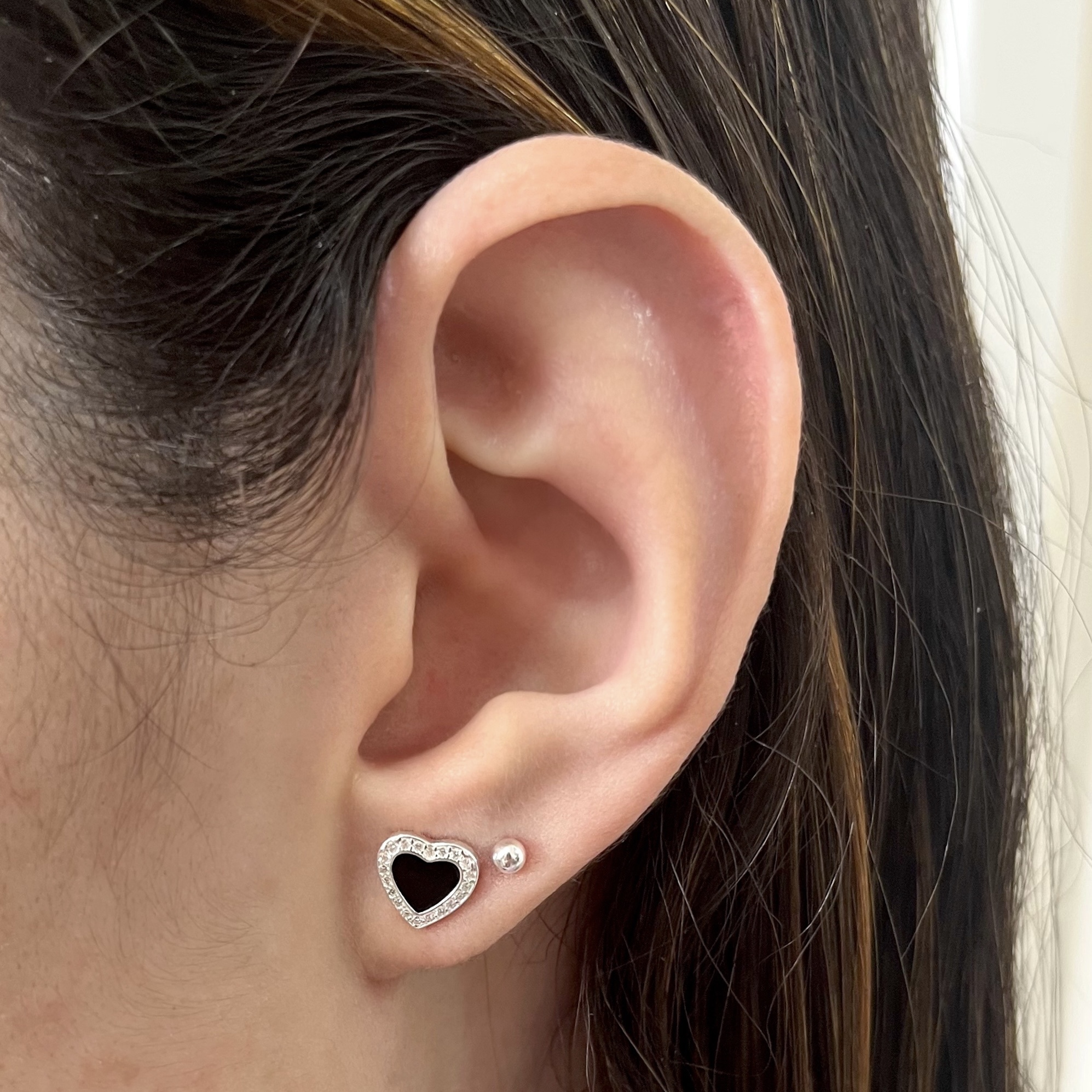 Brinco de Prata Coração Resina Preta Cravejado